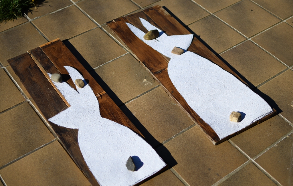 Zuerst musst du eine Zeichnung in Originalgröße anfertigen, um diese anschließend auf das Holz übertragen zu können. Für ein schönes Gesamtbild mit zwei Holzhasen vor der Haustür, solltest du zwei unterschiedlich große Hasen vorzeichnen, einmal 70 cm und einmal 85 cm Höhe. Die Maße kannst du ganz nach eigenem Belieben auch etwas abändern. Das hängt ganz davon ab, wo die Häschen bei dir zuhause stehen dürfen und welche Größe du präferierst.