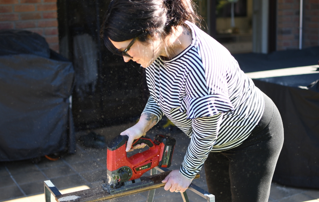 Nun geht es ans Aussägen: Mit der Akku-Stichsäge sägst du die angezeichneten Hasen-Elemente präzise aus. Achte darauf, ruhig und gleichmäßig zu arbeiten, damit die Kanten sauber werden. Ein kleiner Tipp: Lege dir die ausgesägten Teile direkt wieder passend zusammen, damit du den Überblick nicht verlierst und später genau weißt, wie alles zusammengesetzt wird.