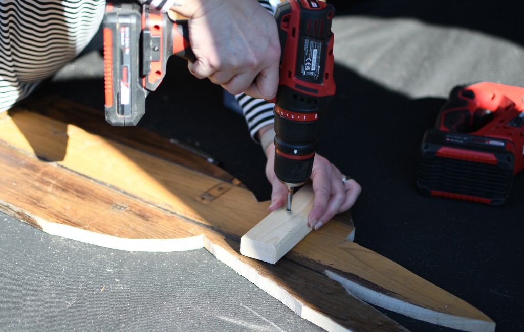 Danach bringst du kleinere und dünnere Lattenreste auf der Rückseite an, um die einzelnen Teile mit dem Akku-Bohrschrauber miteinander zu verschrauben. Je nach Größe der Hasen benötigst du unterschiedlich viele Schrauben – achte darauf, dass alles stabil verbunden ist.